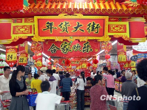 2010年2月3日,海南海口市民在大润发超市“年货大街”购买年货。春节将至,海口各大超市、商场等张灯结彩展销年货,很多市民趁着空闲和商家搞大促销活动,提前开始置办年货。中新社发 邢利民 摄