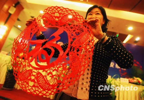 近日,在新疆乌鲁木齐举办的一场迎春活动上,一位市民展示自己的剪纸作品,直径近1米的超大福字。虎年春节临近,该市迎春文化活动络绎不绝,众多市民借此机会纷纷展示才艺,弘扬传统文化精髓。中新社发 刘新 摄