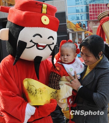 2月8日,福州一商家员工装扮成“财神爷”为过往民众送福。随着中国虎年新春佳节将至,各地民间传统的喜迎春节活动红红火火启动。中新社发 刘可耕 摄