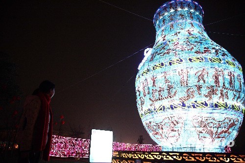2月8日,成都金沙太阳节开幕,一市民在成都一个高18米、重8吨,共约70万个青霉素小药瓶打造出的“水陆攻占图”铜壶灯组下驻足观看,这个庞大的灯组,由数十名工人在短短25天内的时间用巧手捆绑成型,据工作人员介绍,这个药瓶灯将申报吉尼斯世界记录。中新社发 张浪 摄