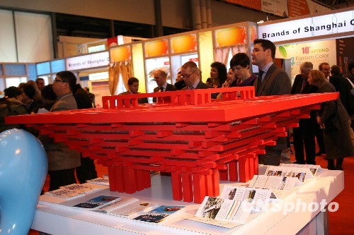 当地时间2月8日,在英国伯明翰举行的“中国品牌商品欧洲展”上,上海世博会借此次展览之机进行推介,图为世博会中国馆“东方之冠”模型亮相展会,吸引了不少参展人士的眼球。中新社发 魏群 摄