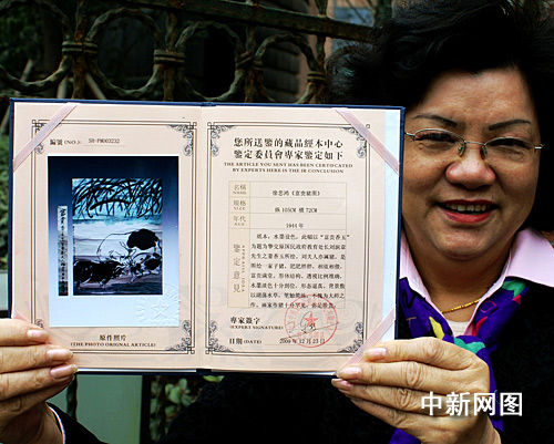 在2009年12月底,这幅画送权威机构北京中博文物检测鉴定中心鉴定,经资深文物鉴定专家陈行一先生鉴定,确认为徐悲鸿大师的真迹。陈行一在鉴定意见中还写道:“刘夫人亦属猪,是图绘一家子猪,肥肥胖胖,相依相偎,富贵满堂。形体结构、透视比例准确,水墨淡色十分到位,形态逼真。背景敷以湖荡水草,笔触简练,不愧为大师之作。画家作猪十分罕见,弥足珍贵。”