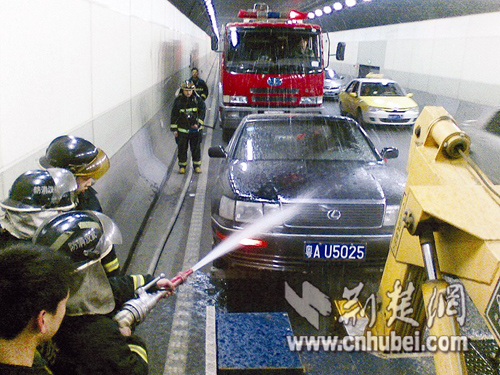 消防员用水枪给轿车引擎降温后,用拖车将故障车辆拖出隧道。由于处置迅速,隧道通行未受影响。(王哲 惠斌)