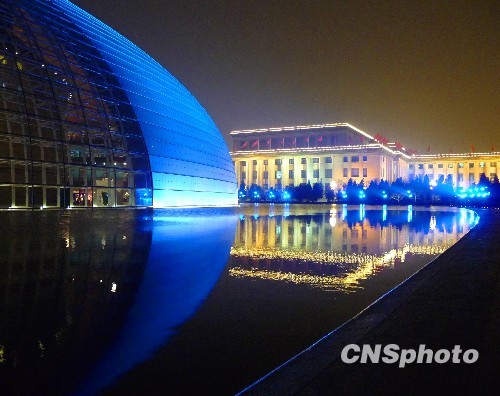 2010年3月3日晚,北京国家大剧院开启景观照明,璀璨的夜色与人民大会堂交相辉映,喜庆全国政协十一届三次会议的胜利召开。中新社发 玉龙 摄