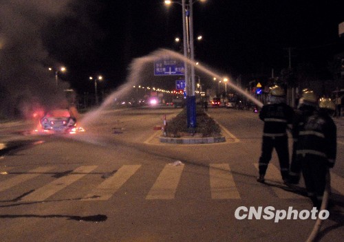 3月3日晚,广西桂林市七星区一辆广州本田小轿车与一辆大卡车相撞,造成小轿车起火。小轿车内的司机被周围群众及时救出,桂林七星消防大队迅速出动成功灭火。中新社发 黄勇军 摄