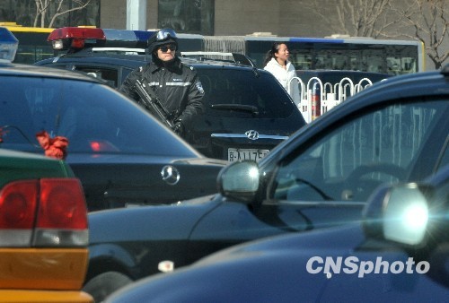 3月9日北京雪后寒风刺骨,驾车族大增,特警在闹市街头持枪设岗,保障此间正在举行的十一届全国人大三次会议和全国政协十一届三次会议。中新社发 贾国荣 摄