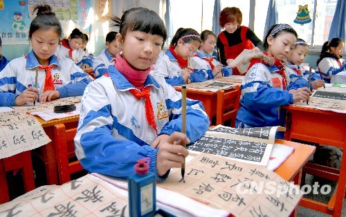 3月10日,辽宁省锦州市劳保小学教师正在指导学生上毛笔课。针对学生目前手按鼠标操作电脑、使用键盘打字较多的实际,该校为传承、弘扬中华民族悠久的汉字书写文化,将软硬笔书法教育纳入校本课程,并在全校近千名小学生中开展了“校园中国风”活动,学校教师自编书法教材,每天组织学生进行十分钟写字练习,每周坚持两节写字课,还因材施教成立了课外书法小组,教育引导学生热爱祖国文字和书法艺术,养成良好的书写习惯,提高规范汉字书写水平。 中新社发 谷进 摄