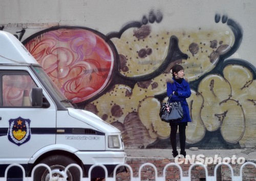 北京警车3月初在街头涂鸦墙周围巡逻,安保系统目前总动员,确保今春人大政协热议民生的“两会”顺利举行。中新社发 贾国荣 摄