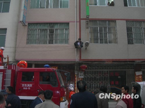 3月11日,广西百色市乐业县城,一名小偷作案后欲沿水管爬下,因其不知水管未连接到地面而被困在电线架上不敢动弹。乐业消防大队接警后赶往现场处置,最终搬来一把梯子将小偷救下。中新社发 杨荣超 摄