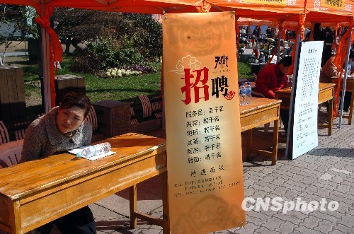 3月11日,一位用工单位的招聘人员正耐心的等待着求职者的来临。当日,杭州市举行2010年春季首场就业招聘会,近100家用工单位提供餐厅服务员、营业员等80多个工种,4000多个工作岗位。与以往招聘会人山人海、门庭若市相比,此次招聘会“门庭冷落”。中新社发 施健学 摄