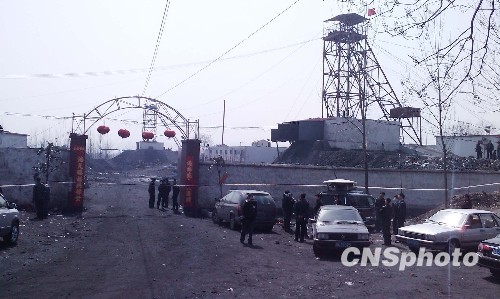 3月15日20点30分,河南新密市东兴煤业有限公司主井西大巷第一绕巷发生电缆着火事故。当班入井31人,截止3月16日凌晨2点,抢救工作结束,6人安全升井,25人遇难。经初步调查,该矿属“六证”不全,违法生产。图为发生矿难的矿井已被封锁。中新社发 关涛 摄