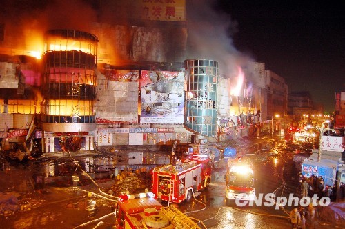 3月28日20时40分左右,长春天元商厦发生火灾。至29日早晨7时,四层商厦全部过火,大火仍未扑灭。天元商厦地处长春最大的光复路批发市场,系一家经营日杂、家具的批发零售商厦。中新社发 邰禄海 摄