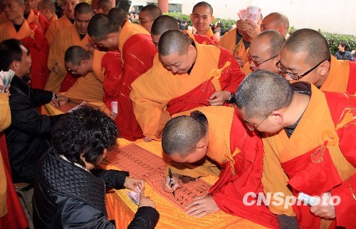 3月30日,上海玉佛寺举行向云南旱灾地区捐赠饮用水活动,僧人们捐款踊跃,祈愿送生命水,旱灾早息。中新社发 潘索菲 摄