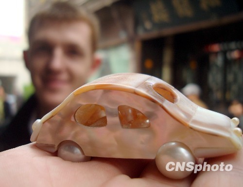 4月11日,苏州山塘街民间艺人石兴林展示用珍珠及蚌壳制成的微型汽车工艺品。中新社发 王建康 摄