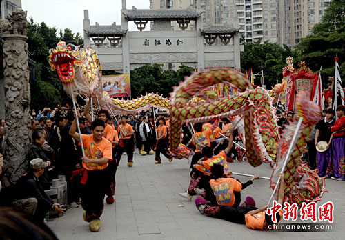 4月16日,一年一度的“三月三仁威庙会”在广州市荔湾泮塘路的仁威庙广场进行,会期为时两日,包括传统的祈福仪式、狮子大巡游、大盆菜乡宴等。广州市荔湾泮塘路的仁威庙修建于宋朝,古老庙会也已延续了数百年之久,与黄埔南海神庙的“菠萝诞”并称广州东、西两大民俗盛会。中新社发 刘卫勇 摄