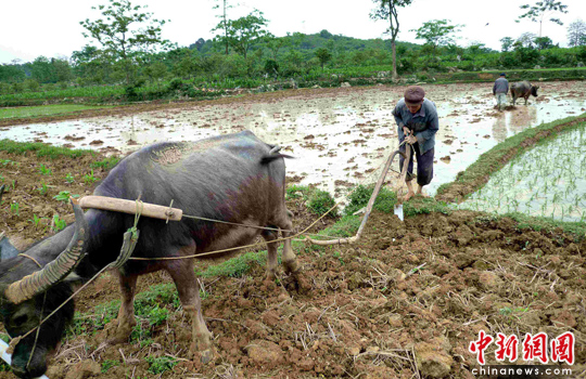 4月16日,农历三月初三,是壮族民众最盛大的传统节日“歌圩节”。在这个本应载歌载舞欢庆节日里,西南重旱区——广西百色市平果县许多壮族农民却顾不上过节,纷纷趁着迟来的几场透雨,抢抓农时,减少旱灾造成的损失。中新社发 罗郅肯 摄