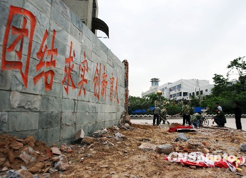 5月5日,河南郑州四中的大门已经被拆除,工作人员正在清理学校大门被拆除后留下的废墟。近日,题为《郑州四中遭遇强行拆迁,校长被打住院》的网帖吸引数万网民关注,引发普遍争议。目前,拆迁主要负责人已就拆迁给四中正常的教学生活秩序带来的不利影响诚恳道歉。中新社发 王中举 摄