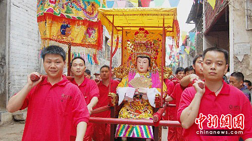 5月4日至5日,素有“千年古榕古镇”的广西平乐县张家镇榕津格外热闹,一个以展现当地妈祖文化、桂剧文化和崇榕文化,推介当地丰富旅游资源为主题的“平乐县榕津文化旅游节”在这里隆重开幕。5月5日,当地民众隆重举行了传统民俗活动――“妈祖出游祭拜”活动。这一天,榕津古圩“三村两街”的民众按传统风俗,把“妈祖”塑像从“妈祖庙”请出,抬上街游拜,以示纪念。中新社发 陶彩忠 摄