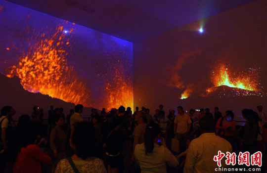 5月6日,上海世博会冰岛馆运用多媒体的方式“再现”了冰岛火山爆发的奇景,吸引众多参观者。中新社发 汤彦俊 摄