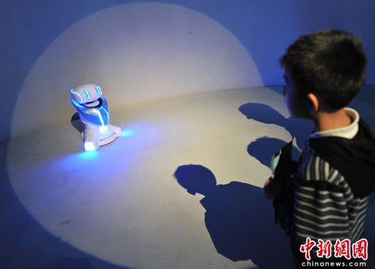 5月7日,一名小男孩为上海世博会博物馆展示的家用机器人所吸引,这台专为家长研制的手机遥控机器人,可以远程帮助照看老人和孩子的实况。中新社发 贾国荣 摄
