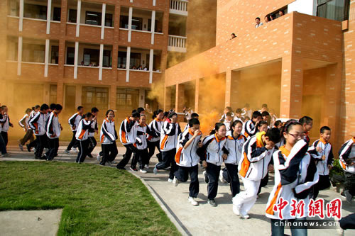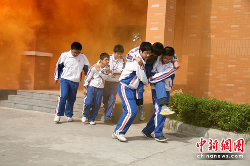 中新网南通5月11日电 (张于)全国防灾减灾日前夕,江苏省南通市应急办、教育局、人防办、地震局、民政局、红十字会,以及消防等部门,在南通市第一初级中学联合开展了市区学校综合应急救援示范演练。图为5月11日下午,在消防人员指导下,学生们正在开展逃生自救。(完)