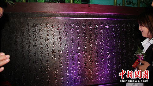5月25日,净重312.5公斤的世界最大黑砖茶在上海世博会湖南馆亮相。这块“万两黑茶砖”以中国黑茶故乡湖南安化天尖茶为原料,砖身镌刻《桃花源记》全文,其规格之大与细节上的精致处理,令前来参观的游客赞叹不已。中新社发 戴钢 摄