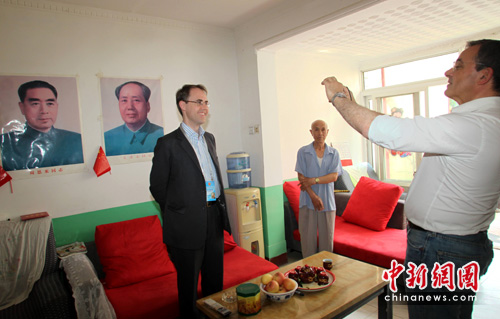 5月26日,法国人民运动联盟代表在北京市大兴区留民营村到村民家中做客,并在家中的伟人像前拍照留念。当日,参加中欧政党高层论坛的代表在留民营村考察基层党组织建设。中新社发 苏丹 摄