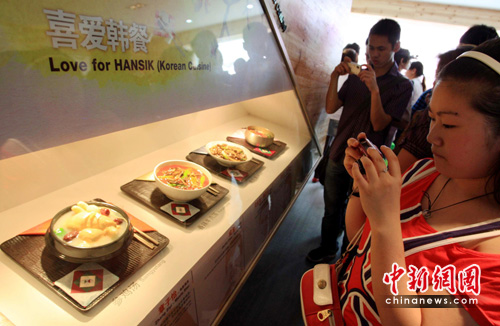 5月26日是上海世博会“韩国馆日”,一组明星喜欢的韩餐受到世博观众的热情追逐,其中有电影明星章子怡喜欢的参鸡汤、成龙钟爱的香辣牛肉面和美国总统奥巴马青睐的烤牛肉等。中新社发 潘索菲 摄