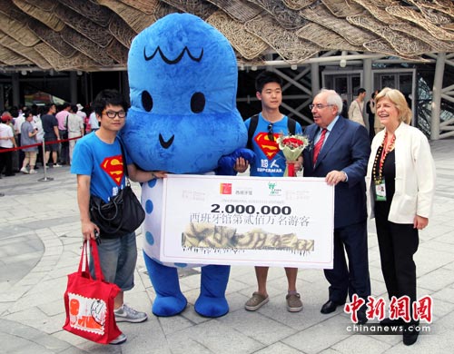 6月21日,来自湖南长沙的22岁男生李芳洲(右三)幸运地成为上海世博会西班牙国家馆的第二百万名游客,并获得馆方提供的花束和大礼包。“西班牙大篮子”成为了上海世博会的一个标志,根据世博会前50天的数据,逾1600万名游客中,超过百分之十二的游客都认为用藤条包覆的西班牙国家馆是不能错过的展馆之一。中新社发 肖前辉 摄