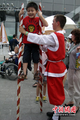 6月23日,比利时高跷甫一亮相世博比利时—欧盟馆前坪便吸引了众多游客的观看与参与。比利时以民间节日丰富多采而著称于世,号称“千节之国”,“和飞龙战斗节”、“巨人节”、“火腿节”、“虾节”……简直数不胜数。其中最吸引民俗学家注意的要数有300多年的历史的“高跷节”。中新社发 肖前辉 摄