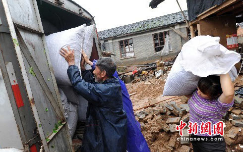 6月24日,一户受灾村民在福建建阳市江口镇横塘村固县自然村被严重损毁的房屋前,抢运存储于家中高处未被洪水浸泡的岩茶。自6月13日以来,福建轮番遭受特大暴雨袭击,造成了历史罕见的自然灾害。仅闽北建阳市,初步统计,全市受灾人口14.6万人,3236间房屋倒塌、水稻、烟叶等农作物受灾面积17.4万亩,直接经济损失4.658亿元。中新社发 刘可耕 摄