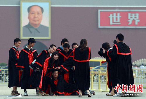 6月25日,一群即将毕业的大学生来到北京天安门广场,穿上学士服拍照,纪念在北京的大学生活。中新社发 苏丹 摄