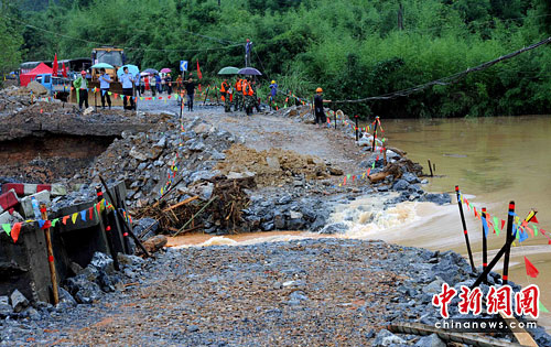 6月25日,国道316线闽北顺昌境内连接邵武、光泽及顺昌的交通要道的新屯桥被洪水冲毁。从6月23日起,福建闽北地区再次遭遇强降雨。中新社发 刘可耕 摄