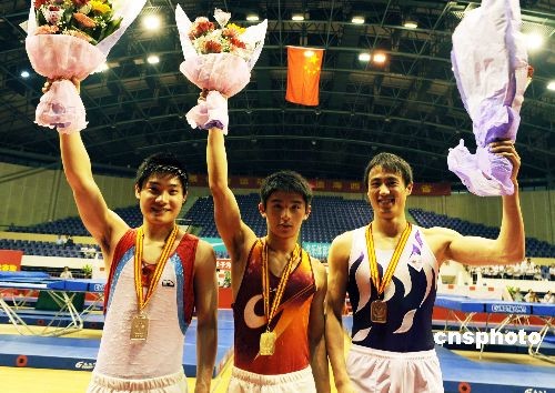 5月23日,在全国蹦床锦标赛男子单跳个人决赛中分获前三名的杨松、王劼谞、潘华年在颁奖台上挥动花束。当日,在福州举行的第十一届全运会蹦床预赛暨2009年全国蹦床锦标赛男子单跳个人决赛中,福建选手杨松、广东选手王劼谞、浙江选手潘华年分获前三名。中新社发 刘可耕 摄