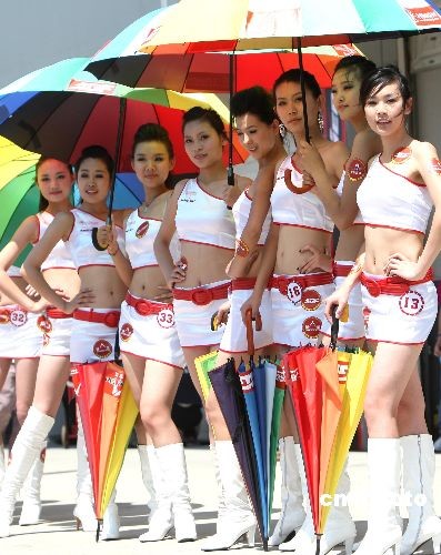 5月31日,亚洲方程式(AGF)国际公开赛09赛季北京站比赛在金港国际赛车场举行,来自中国内地、香港、德国的10支车队共20名顶尖车手参赛。图为30多名赛车宝贝冒着酷暑争先亮相。中新社发 赵振清 摄