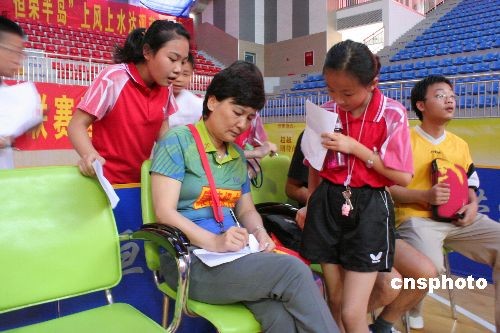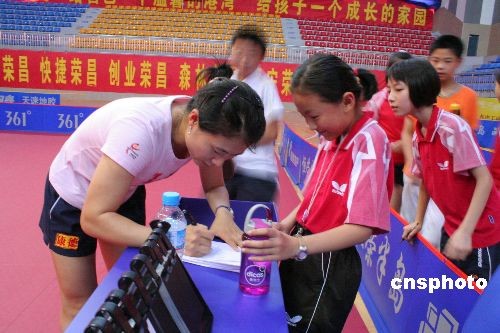 6月30日,参加“361°中国乒超联赛”的重庆康德队队员及教练受到重庆荣昌县乒乓粉丝的欢迎。2009年“361°中国乒超联赛”女子团体第一阶段比赛重庆康德对阵辽宁鞍钢,将于7月1日在重庆市荣昌县体育馆举行。辽宁队的郭跃、康德队的金景娥(韩国)等选手将展开对决。中新社发 朱芸锋 摄