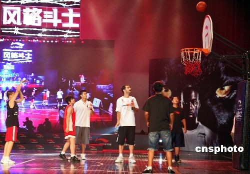 7月13日晚,美国NBA超级球星洛杉矶快艇队的卡尔德隆和多伦多猛龙队的巴朗·戴维斯到河北石家庄参加“李宁篮球风格会”。河北球迷第一次与NBA球星亲密接触。图为卡尔德隆(右三)与球迷互动,现场指导小球迷投篮技巧。中新社发 翟羽佳 摄