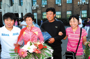 8月26日,白雪与到火车站迎接的家人在一起。当日,在柏林夺得世界田径锦标赛女子马拉松金牌的白雪回到家乡黑龙江省齐齐哈尔市,受到热烈欢迎。(王勇刚)