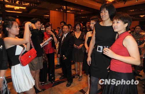 中国驻洛杉矶总领事馆九月二十八日晚在洛杉矶举行庆祝中华人民共和国成立六十周年国庆招待会,当地华人华侨、各界友人、加州和洛杉矶政要等千余名嘉宾出席了招待会。图为前中国女排队员、主教练郎平在招待会上被众多粉丝包围。郎平说,在这个伟大的日子里,作为中国人非常骄傲,祝愿祖国繁荣昌盛。中新社发 张炜 摄