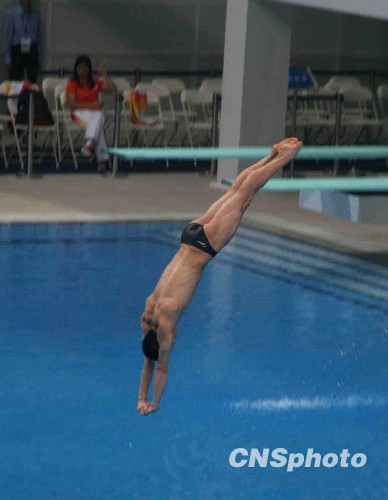 作为中国第十一届全国运动会跳水比赛的收官之战,十月十二日于山东省城济南奥体中心游泳馆举行的男子十米跳台决赛受到了众人瞩目。经过激烈的竞争,解放军队的周吕鑫以五七零点二五分的成绩将本届跳水最后一块金牌稳稳收入囊中。图为解放军队的周吕鑫在男子十米跳台决赛中。中新社发 王超 摄