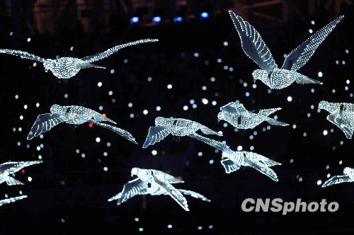十月十六日晚,中华人民共和国第十一届运动会在山东济南奥体中心隆重开幕,开幕式晚会上和平鸽在体育场飞翔。中新社发 陈文 摄