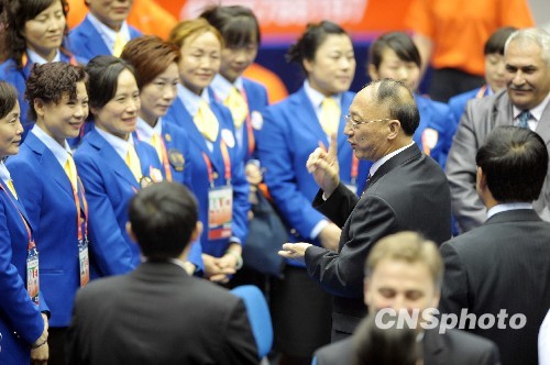 10月18日下午,中国国家体育总局局长刘鹏在济南皇亭体育馆出席全运会58公斤级举重颁奖礼,赛后看望举重裁判人员。中新社发 陈文 摄