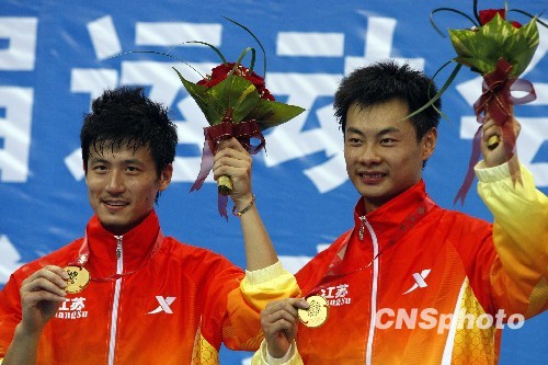 10月18日,全运会羽毛球男双决赛,来自江苏的蔡赟(左)/徐晨2-0战胜广东组合傅海峰/朱李华,获得全运会羽毛球男子双打的冠军。中新社发 张宇 摄