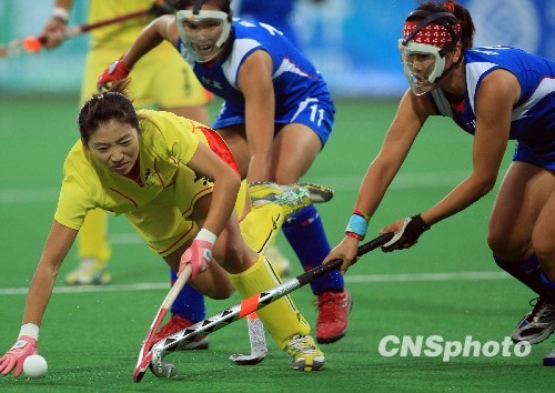 10月18日,在全运会女子曲棍球决赛中,辽宁队以2:0战胜江苏队获得冠军。图为辽宁队17号李红侠(黄)在比赛中拼抢。中新社发 汤彦俊 摄