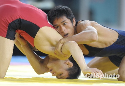 10月19日,广东选手陈华(兰)在山东济南历城体育馆战胜队友洪晓槟(红),夺得第十一届全运会55公斤级男子自由式摔跤冠军。