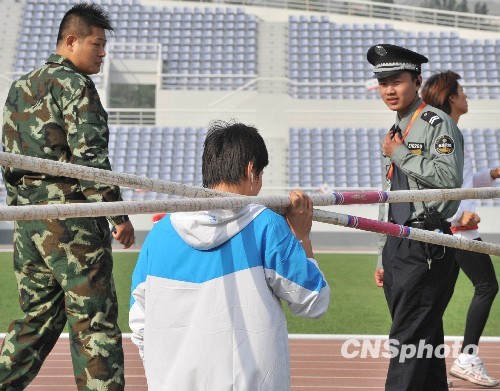 10月22日清晨,十一届全运会济南奥体中心热身训练场竟然出现彪型保安对采访记者下达禁拍令的怪现象,同时表示别为难他们。日前有媒体报道,昨晚飞抵济南的刘翔可能来此训练。中新社发 贾国荣 摄