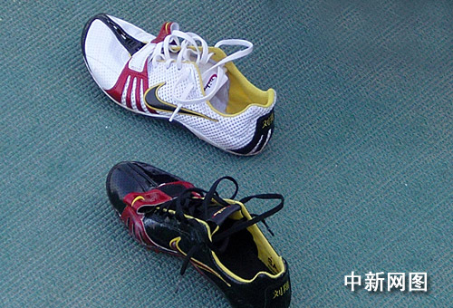 中新网济南10月22日电 (记者 沈晨 翁阳) 二十二日,昨晚抵达济南的刘翔在奥体中心田径训练场进行首堂训练课。刘翔今天穿了一双印有他名字的钉鞋,他左脚穿的是白色的新鞋,右脚的黑鞋是相对软一些、舒适一些的的旧鞋,有利于保护他的伤脚。