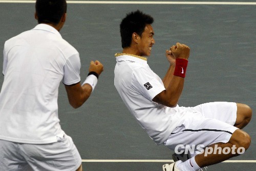 10月26日,第十一届全运会网球男子双打决赛在山东济南举行,江苏队曾少眩(右)/张择战胜天津队李喆/王钰,获得冠军。中新社发 张宇 摄