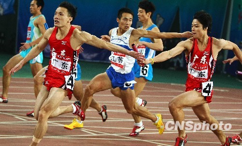 10月26日,全运会田径男子4x100米接力决赛,广东队(红)发挥完美以39秒22夺得金牌,四川队以39秒35夺得银牌,北京队39秒42摘得铜牌。中新社发 富田 摄
