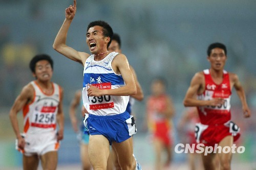 10月26日,在全运会男子5000米比赛中,江苏选手林向前以13分38秒73的成绩一举夺冠,摘得金牌。中新社发 富田 摄